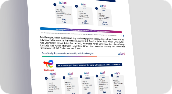 TotalEnergies , one of the leading integrated energy playe rs globally, has strategic alliance with the Adani portfolio across its four verticals, namely LNG Terminal ( Adani Total Private Limited ), City Gas Distribution ( Adani Total Gas Limited), Renewable Power Generation ( Adani Green Energy Limited) and Green Hy drogen ecosystem ( Adani New Industries Limited) with committed investments of USD 7.3 bn over past 3 years. Adani has also successfully concluded the IPO of portfolio FMCG company AWL (Adani Wilmar Limited) amounting to INR 36 bn (USD 450 mn) during the month of February 2022.