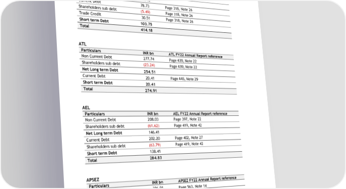 Total 9 . 95 APL Particulars INR bn A P L FY22 Annual Report reference Non Current Debt 378.71 Page 312, Note 20 Shareholders sub debt (68.28) Page 312, Note 20 Net Long term Debt 310.43 Current Debt 78.73 Page 318, Note 26 Shareholders sub debt (5.49) Page 318, Note 26 Trade Credit 30.51 Page 318, Note 26 Short term Debt 103.75 Total 414.18 ATL Particulars INR bn A T L FY22 Annual Report reference Non Current Debt 277.74 Page 439, Note 22 Shareholders sub debt (23.24) Page 439, Note 22 Net Long term Debt 254.51 Current Debt 20.41 Page 445, Note 29 Short term Debt 20.41 Total 274.91 AEL Particulars INR bn AE L FY22 Annual Report reference Non Current Debt 208.03 Page 397, Note 22 Shareholders sub debt (61.62) Page 419, Note 42 Net Long term Debt 146.41 Current Debt 202.20 Page 402, Note 27 Shareholders sub debt (63.79) Page 419, Note 42 Short term Debt 138.41 Total 284.83 APSEZ Particulars INR bn A P SEZ FY22 Annual Report reference Non Current Debt 396.91 Page 563, Note 14 Shareholders sub debt (1.15) Page 563, Note 14 Net Long term Debt 395.76 Current Debt 51.61 Page 570, Note 18 Trade Credit 9.00 Page 570, Note 18 Short term Debt 60.61 Total 456.37