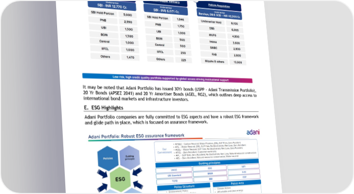 Further, Adani Portfolio companies have demonstrated successful syndication of the banking transactions, resulting in de -risking of the banks in volatile markets. Case in point being Holcim Acquisition t o international banks, Navi Mumbai Airport and Kutch Copper refinery to domestic banks. It may be noted that Adani Portfolio has issued 30Yr bonds (USPP – Adani Transmission Portfolio), 20 Yr Bonds (APSEZ 2041) and 20 Yr Amortiser Bonds (AGEL, RG2), which outlines deep access to international bond markets and infrastructure investors. E. ESG Hi ghlights Adani Portfolio companies are fully committed to ESG aspects and have a robust ESG framework and glide path in place, which is focused on assurance framework.