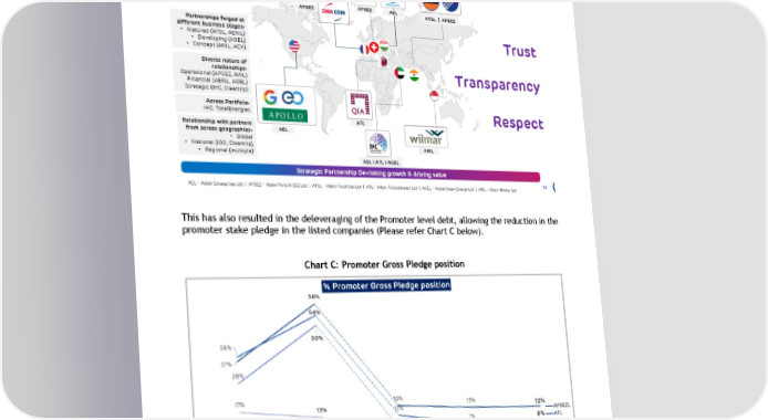 equity from marquee investors like TotalEnergies, IHC, QIA, Warburg Pincus etc . The overview of our partnership model is as presented below. This has also resulted in the deleveraging of the Promoter level debt, allowing the reduction in the promoter stake pledge in the listed companies (Please refer Chart C below) . Chart C: Promoter Gross Pledge position The equity contribution includes the platform level investments made by IHC across 3 of its portfolio companies AEL (USD 1 bn), AGEL (USD 500 mn) and ATL (USD 500 mn) totaling to USD 2 bn which was settled in May 2022.