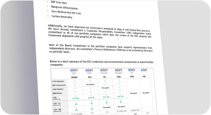We have identified key ESG risks and adopted multiple mitigation measures which are business specific for e.g. Mangrove Afforestation in Adani Ports and Increasing Renewable mix in power procurement from 3% in FY21 to 30% FY23 and 60% by FY27 in Adani Elec tricity Mumbai, part of Adani Transmission Limited. The portfolio companies have adopted best -in- class global disclosures and standards like TCFD, SBTi, CDP, SDGs. The portfolio companies are on track to achieve the following: − Water neutral − Zero Waste to Landfill − SUP free sites − Mangrove Afforestation − Zero Biodiversity Net Loss − Carbon Neutrality Additionally, we have improved our Governance standards to align it with Global Best practices. We have already constituted a Corporate Responsibility Commi ttee (100% independent board committee) in all of our portfolio companies which does the review of the ESG progress and framework alignment with progress of the same. Most of the Board Committees in the portfolio companies have majority representation fr om independent directors. All committee’s Terms of References (TOR) has to be reviewed by the board on periodic basis. Below is a short summary of the ESG credentials and environmental commitments of Adani Portfolio companies