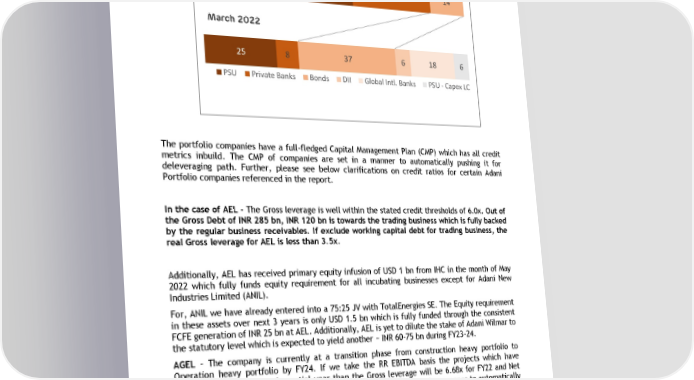 Chart B: Diversifying long term debt profile towards higher share of bonds The portfolio companies have a full -fledged Capital Management Plan (CMP) which has all credit metrics inbuild. The CMP of companies are set in a manner to automatically pushing it for deleveraging path. Further, please see below clarifications on credit ratios for certain Adani Portfolio companies referenced in the report. In the case of AEL - The Gross leverage is well within the stated credit thresholds of 6.0x. Out of the Gross Debt of INR 285 bn, INR 1 20 bn is towards the trading business which is fully backed by the regular business receivables. If exclude working capital debt for trading business, the real Gross leverage for AEL is less than 3.5 x. Additionally, AEL has received primary equity infusion of USD 1 bn from IHC in the month of May 2022 which fully funds e quity requirement for all incubating businesses except for Adani New Industries Limited ( ANIL). For, ANIL we have already entered into a 75:25 JV with TotalEnergies SE. The Equity requirement in these assets over next 3 years is only USD 1.5 b n which is fully funded through the consistent FCFE generation of INR 25 b n at AEL. Additionally, AEL is yet to dilute the stake of Adani Wilmar to the statutory level which is expected to yield another ~ INR 60 -75 bn during FY23 -24. AGEL – The company is currently at a transition phase from construction heavy portfolio to Operation heavy portfolio by FY24. If we take the RR EBITDA basis the projects which ha ve generated revenue for only partial year than the Gross leverage will be 6.68x for FY22 and Net Leverage will stand at 6. 10x. Further, t he CMP of companies are set in a manner to automatically pushing it for deleveraging path. AGEL will be below 4.5x Net Debt to EBITDA in 10 years’ time as per the current CMP . C. Equity Injection in the Adani Portfolio Adani Portfolio has raised USD 16 bn Equity under a systematic capital management plan for all the Portfolio companies over the last 3 years as a combination of primary, secondary and committed 25 55 8 31 37 14 6 18 6 PSU Private Banks Bonds DII Global Intl. Banks PSU - Capex LC March 2016 March 2022