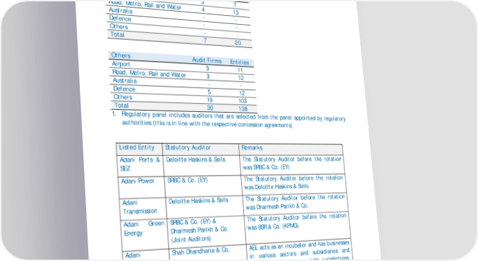 Road, Metro, Rail and Water - - Australia 1 16 Defence 1 1 Others 2 2 Total 7 23 1 Regulatory Panel Audit Firms Entities Airport 3 7 Road, Metro, Rail and Water 4 13 Australia - - Defence - - Others - - Total 7 20 Others Audit Firms Entities Airport 3 11 Road, Metro, Rail and Water 3 12 Australia - - Defence 5 12 Others 19 103 Total 30 138 1. Regulatory panel includes auditors that are selected from the panel appointed by regulatory authorities (this is in line with the respective concession agreements) Listed Entity Statutory Auditor Remarks Adani Ports & Deloitte Haskins & Sells The Statutory Auditor before the rotation SEZ was SRBC & Co. (EY) Adani Power SRBC & Co. (EY) The Statutory Auditor before the rotation was Deloitte Haskins & Sells Adani Deloitte Haskins & Sells The Statutory Auditor before the rotation Transmission was Dharmesh Parikh & Co. Adani Green SRBC & Co. (EY) & The Statutory Auditor before the rotation Energy Dharmesh Parikh & Co. was BSR & Co. (KPMG) (Joint Auditors) Adani Shah Dhandharia & Co. AEL acts as an incubator and has businesses Enterprises & includes 27 other in various sectors and subsidiaries and (AEL) Statutory Audit Firms like associates spread over eight jurisdictions. Ernst & Young, PKF, Walker There are more than 27 Statutory Audit firms Chandiok & Co. & K S Rao & which audit the various entities within Adani Co., etc. Enterprises which include a mix of big four Statutory Auditors as well as statutory auditors who are highly reputed in their respective jurisdictions. 44