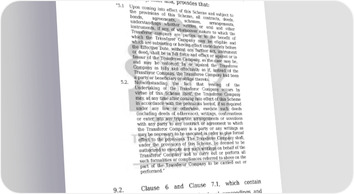 COMP/135/2011 28/49 ORDER have arisen in order to give effect to the provisions of this clause.” 9.1. Clause 5 of the proposed Scheme which makes provision regarding contracts etc. to which the Transferor Company is party, inter alia, provides that: “5.1 Upon coming into effect of this Scheme and subject to the provisions of this Scheme, all contracts, deeds, bonds, agreements, schemes, arrangements, understandings whether written or oral and other instruments, if any, of whatsoever nature to which the Transferor company are parties or to the benefit of which the Transferor Company may be eligible and which are subsisting or having effect immediately before the Effective Date, without any further act, instrument or deed, shall be in full force and effect or against or in favour of the Transferee Company, as the case may be, and may be enforced by or against the Transferee Company as fully and effectually as if, instead of the Transferor Company, the Transferee Company had been a party or beneficiary or oblige thereto. 5.2. Notwithstanding the fact that vesting of the Undertaking of the Transferor Company occurs by virtue of this Scheme itself, the Transferee Company may, at any time after coming into effect of this Scheme in accordance with the provisions hereof, if so required under any law or otherwise, execute such deeds (including deeds of adherence), writings, confirmations or enter into any tripartite arrangements or novations with any party to any contract or agreement to which the Transferor Company is a party or any writings as may be necessary to be executed in order to give formal effect to the provisions. The Transferee Company shall, under the provisions of this Scheme, be deemed to be authorized to execute any such writings on behalf of the Transferor Company and to carry out or perform all such formalities or compliances referred to above on the part of the Transferor Company to be carried out or performed.” 9.2. Clause 6 and Clause 7.1, which contain provisions with reference to the legal proceedings and employees, read thus: “6. Legal Proceedings Upon the coming into effect of this Scheme, all suits, actions, and other proceedings including legal and taxation proceedings, (including before any statutory or quasi-judicial authority or tribunal) by or against the Transferor Company, whether pending and/or arising on Downloaded on : Fri Jan 27 19:33:28 IST 2023
