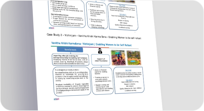 Vi hin am Clean u Creating omen Entrepreneurs Brand Creation Clean u CreatingEmploymentforLocalcommunity Employing 28 women, providing end to end Support of services related to health and hygiene of Adani oundation different sections of society such as schools, hospitals, govtbuildings. THE STORY De elopingleadership Access to human and Empowered28Local Communitywomenof Self funded program financial capital. i hinjamby shaping them into self reliant Hire,train develop workforce. WomenEntrepreneurs Ensuringpropercapital management Facilitate networking Building assets for the Company along with by increasing access to THE IMPACT the growth. local and lobal Improved Standard of Living alleviate markets. Poverty OperationalE cellence: Creatingnetworkfor consumer complaints. Ensuring diversity in Respect in Society Proper channel for correct assessment of hiring activities. Self reliance worktobe executed. uality Education forc hildren Dynamic pricing model based on location, Help in adopting Livelihood earning time,and payingcapacity of consumer. changing technology 17 Case Study 2 – Vizhinjam – Vanitha Krishi Karma Sena – Enabling Women to be self reliant Vanitha rishi arma Sena Vi hin am Enabling omen to be Self Reliant arm Schools Imparting otnh e ob training for Entrepreneurship enabling Self reliance Support of Employing anitha rishi arma Sena with 20 Adani oundation women, Lead by Shashikala (President), Udaya Rani(treasurer)Pr, asanna umari(Secretary) Providingbothservices products: Access to financial THE STORY Ser ice:sTeaching skill set providingtechno capital for building solutions to households for growing farm business Establishmentof rishi armaSena with20 products. It has broughttransformativechanges Local womenof i hinjamby enablingthem in society by moneti ingsurplus land in the Training program to todevelopsubsistentBusinessEnterprise. society. overcome social psychological constraints THE IMPACT roduc:t Availability of Organic vegetables Improved Standard of Living (which are seasonalin nature). Ensuringprice Regular training and Respect in Society paritywithlocal market,maintainingdynamic monitoring for skill Self reliance pricingdependingon demandand supply of the upgradation and enabling uality Education for their children product. women self reliance. Livelihood earning 23