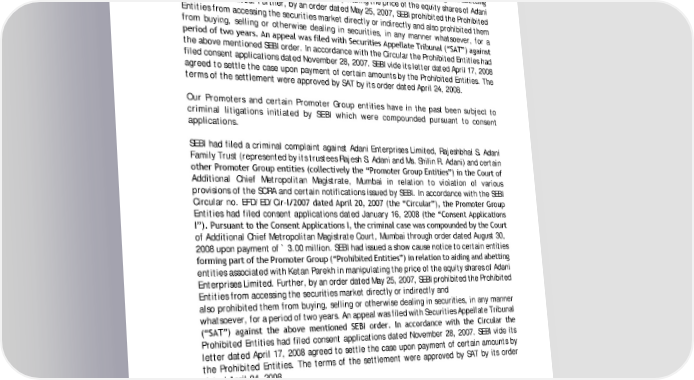 provisions of the SCRA and certain notifications issued by SEBI. In accordance with the SEBI Circular no. EFD/ED/Cir-I 2007 dated April 20, 2007 (the “Circular”), the Promoter roup Entities had filed consent applications dated January 16, 2008 (the “Consent Applications I”). Pursuant to the Consent Applications I, the criminal case was compounded by the Court of Additional Chief Metropolitan Magistrate Court, Mumbai through order dated August 30, 2008 upon payment of ` 3.00 million. SEBI had issued a show cause notice to certain entities forming part of the Promoter roup (“Prohibited Entities”) in relation to aiding and abetting entities associated with Ketan Parekh in manipulating the price of the equity shares of Adani Enterprises Limited. Further, by an order dated May 25, 2007, SEBI prohibited the Prohibited Entities from accessing the securities market directly or indirectly and also prohibited them from buying, selling or otherwise dealing in securities, in any manner whatsoever, for a period of two years. An appeal was filed with Securities Appellate Tribunal (“SAT”) against the above mentioned SEBI order. In accordance with the Circular the Prohibited Entities had filed consent applications dated November 28, 2007. SEBI vide its letter dated April 17, 2008 agreed to settle the case upon payment of certain amounts by the Prohibited Entities. The terms of the settlement were approved by SAT by its order dated April 24, 2008. Our Promoters and certain Promoter Group entities have in the past been subject to criminal litigations initiated by SEBI which were compounded pursuant to consent applications. SEBI had filed a criminal complaint against Adani Enterprises Limited, Rajeshbhai S. Adani Family Trust (represented by its trustees Rajesh S. Adani and Ms. Shilin R. Adani) and certain other Promoter roup entities (collectively the “Promoter roup Entities”) in the Court of Additional Chief Metropolitan Magistrate, Mumbai in relation to violation of various provisions of the SCRA and certain notifications issued by SEBI. In accordance with the SEBI Circular no. EFD/ED/Cir-I 2007 dated April 20, 2007 (the “Circular”), the Promoter roup Entities had filed consent applications dated January 16, 2008 (the “Consent Applications I”). Pursuant to the Consent Applications I, the criminal case was compounded by the Court of Additional Chief Metropolitan Magistrate Court, Mumbai through order dated August 30, 2008 upon payment of ` 3.00 million. SEBI had issued a show cause notice to certain entities forming part of the Promoter roup (“Prohibited Entities”) in relation to aiding and abetting entities associated with Ketan Parekh in manipulating the price of the equity shares of Adani Enterprises Limited. Further, by an order dated May 25, 2007, SEBI prohibited the Prohibited Entities from accessing the securities market directly or indirectly and also prohibited them from buying, selling or otherwise dealing in securities, in any manner whatsoever, for a period of two years. An appeal was filed with Securities Appellate Tribunal (“SAT”) against the above mentioned SEBI order. In accordance with the Circular the Prohibited Entities had filed consent applications dated November 28, 2007. SEBI vide its letter dated April 17, 2008 agreed to settle the case upon payment of certain amounts by the Prohibited Entities. The terms of the settlement were approved by SAT by its order dated April 24, 2008. Litigation against Directors There are two outstanding legal proceedings involving Mr. Gautam S. Adani. These relate to (i) a civil dispute seeking to restrain defendants named therein from proceeding with a cold chain project, and (ii) alleged violation of certain provisions of the Customs Act, 1962 emanating from alleged misuse of advance licence granted to a third party for import of metallurgical coke and evasion of customs duty in relation thereof. These proceedings are pending at various stages of adjudication. There are certain outstanding legal proceedings 68