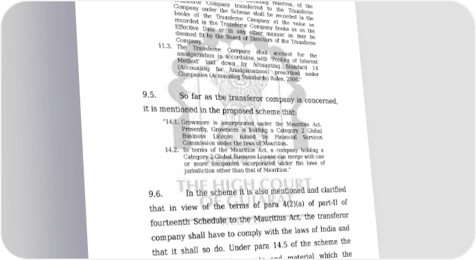 COMP/135/2011 30/49 ORDER the formalities of the Stock Exchanges.” 9.4. As regards the accounting procedure, it is, inter alia, provided that: “11.2. All assets and liabilities, including reserves, of the Transferor Company transferred to the Transferee Company under the Scheme shall be recorded in the books of the Transferee Company at the value as recorded in the Transferor Company books as on the Effective Date or in any other manner as may be deemed fit by the Board of Directors of the Transferee Company. 11.3. The Transferee Company shall account for the amalgamation in accordance with ‘Pooling of Interest Method’ laid down by Accounting Standard 14 (Accounting for Amalgamations) prescribed under Companies (Accounting Standards) Rules, 2006.” 9.5. So far as the transferor company is concerned, it is mentioned in the proposed scheme that: “14.1. Growmore is incorporated under the Mauritius Act. Presently, Growmore is holding a Category 2 Global Business License issued by Financial Services Commission under the laws of Mauritius. 14.2. In terms of the Mauritius Act, a company holding a Category 2 Global Business License can merge with one or more companies incorporated under the laws of jurisdiction other than that of Mauritius.” 9.6. In the scheme it is also mentioned and clarified that in view of the terms of para 4(2)(a) of part-II of fourteenth Schedule to the Mauritius Act, the transferor company shall have to comply with the laws of India and that it shall so do. Under para 14.5 of the scheme the details about the documents and material which the companies will have to submit before the Registrar of Companies of Mauritius are also mentioned. 9.7. Another relevant aspect with reference to the Downloaded on : Fri Jan 27 19:33:28 IST 2023