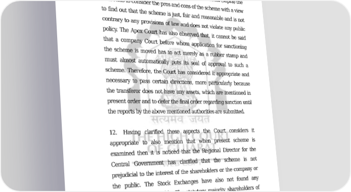 COMP/135/2011 42/49 ORDER amalgamation / scheme and such aspects are mainly in the realm of the commercial wisdom of the Board of Directors and the members of the company. However, as observed by the Apex Court in the decision in the case of Miheer H. Mafatlal (supra) the Court has to consider the pros and cons of the scheme with a view to find out that the scheme is just, fair and reasonable and is not contrary to any provisions of law and does not violate any public policy. The Apex Court has also observed that, it cannot be said that a company Court before whom application for sanctioning the scheme is moved has to act merely as a rubber stamp and must almost automatically puts its seal of approval to such a scheme. Therefore, the Court has considered it appropriate and necessary to pass certain directions, more particularly because the transferor does not have any assets, which are mentioned in present order and to defer the final order regarding sanction until the reports by the above mentioned authorities are submitted. 12. Having clarified these aspects the Court considers it appropriate to also mention that when present scheme is examined then it is noticed that the Regional Director for the Central Government has clarified that the scheme is not prejudicial to the interest of the shareholders or the company or the public. The Stock Exchanges have also not found any provisions objectionable. The statutory majority shareholders of both the companies have also approved the scheme. Under the circumstances, on overall consideration of the scheme there does not appear, except the above mentioned aspects, any other objectionable feature in the scheme which would oblige the Court to decline the sanction requested for. The Regional Director, the Downloaded on : Fri Jan 27 19:33:28 IST 2023
