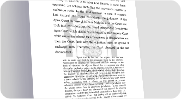 COMP/135/2011 40/49 ORDER company. The proposal was approved by the majority shareholders of 90.85% in number and 99.32% in value. In present case, as mentioned hereinabove earlier while considering the Chairman's report, it is noticed that majority of 95.76% in number and 99.99% in value have approved the scheme including the provisions related to exchange ratio. In the said decision in case of Alembic Ltd. (supra) the Court considered the judgment of the Apex Court in case of Miheer Mafatlal and the Court also took into consideration the broad contours laid down by the Apex Court which should be considered by the Company Court while examining scheme for arrangement or amalgamation and then the Court dealt with the objections raised on ground of exchange ratio. Thereafter, the Court observed, in the said decision that:- “Apart from the fact that the objector has not been able to make any dent in the reasoning given by the Chartered Accountants for adopting the discounted cash flow technique as the basis of valuation, the objector himself has not suggested any other alternative method or ratio. In the aforesaid decision in the case of Miheer H Mafatlal (Supra), the Apex Court has already held that when the majority of the shareholders with their open eyes have given their approval to the scheme, even if in the view of the Court there would be a better scheme for the Company and its members, the Court cannot refuse to sanction such a scheme on that ground as it would otherwise amount to the Court exercising appellate jurisdiction over the scheme rather than its supervisory jurisdiction. In the aforesaid decision, the Apex Court has also quoted with approval the following observations made by the Madras High Court in Kamla Sugar Mills Ltd., (1984) 55 Company Cases 308 dealing with an identical objection about the exchange ratio adopted in the Scheme of Compromise and Arrangement : "Once the exchange ratio of the shares of the transfereecompany to be allotted to the shareholders of the transferorcompany has been worked out by a recognized firm of chartered accountants who are experts in the field of valuation and if no mistake can be pointed out in the said valuation, it is not for the Court to substitute its exchange ratio, especially when the same has been accepted without demur by the overwhelming majority of the shareholders or the two companies or to say that the shareholders in their collective wisdom should not have accepted the said exchange ratio on the ground that it Downloaded on : Fri Jan 27 19:33:28 IST 2023