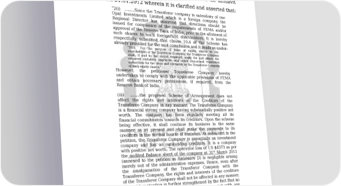 COMP/135/2011 8/49 ORDER 3.3. In response to the observations made and objections raised by the Regional Director, the petitioner company has, through its Company Secretary and Authorized Signatory Mr. Rahul Shah filed an affidavit dated 21.01.2012 wherein it is clarified and asserted that: “2(i) ……..Since the Transferor company is subsidiary of one Opal Investments Limited which is a foreign company, the Regional Director has observed that directions should be issued for compliance of the requirements of FEMA and/or approval of the Reserve Bank of India, prior to the allotment of such shares to such foreign/NRI shareholders. It is hereby respectfully submitted that clause 10.4 of the Scheme has already provided for the said compliance and it reads as under: “10.4. For the purpose of issue of equity shares to the shareholders of the Transferor Company, the Transferee Company shall, if and to the extent required, apply for and obtain the required statutory approvals and other concerned regulatory authorities for the issue and allotment by the Transferee Company of such equity shares.” However, the petitioner Transferee Company hereby undertakes to comply with the applicable provisions of FEMA and obtain necessary permissions, if required, from the Reserve Bank of India. (iii) …….the proposed Scheme of Arrangement does not affect the rights and interests of the Creditors of the Transferee Company in any manner. The Transferee Company is a financial strong company having substantially positive net worth. The company has been regularly meeting all its financial commitments towards its creditors. Upon the scheme being effective, it shall continue its business in the same manner as at present and shall make the payments to its creditors in the normal course of business. As submitted in the petition, the Transferor Company is essentially an investment company and has no outstanding creditors. It is a company with positive net worth. The operative loss of US $4373 as per st the audited Balance sheet of the company at 31 March 2011 (annexed to the petition as Annexure D) is negligible arising merely out of the administrative expenses. Hence, even after the amalgamation of the Transferor Company with the Transferee Company, the rights and interests of the creditors of the Transferee Company shall not be affected in any manner. The said contention is further strengthened by the fact that no creditor of the Transferee Company has come out with any objection whatsoever to the proposed scheme. (iv) ………It is hereby respectfully submitted that as provided in the said Clause 13 of the Scheme, and as per the applicable provisions of the Mauritius Act, the Petitioner Company hereby undertakes to file the order passed by this Hon’ble Court, sanctioning the scheme, with the Office of the Registrar of Companies, Mauritius in order to enable the said authority to dissolve the said Transferor company without Downloaded on : Fri Jan 27 19:33:28 IST 2023