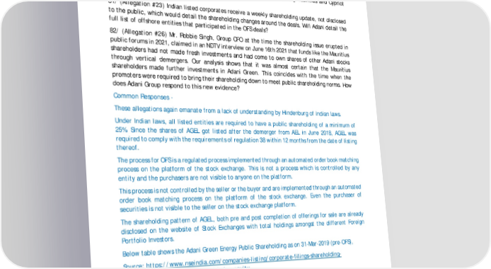 have such information for its public shareholders under laws of India. Hence we cannot comment on trading pattern or behavior of public shareholders. 80/ (Allegation #22) In 2019, Adani Green Energy completed two offerings for sale (OFS) that were critical for ensuring that its public shareholders were above the 25% listing threshold requirement. What portion of these OFS deals were sold to offshore entities, including Mauritius and Cypriot entities named in our report? 81/ (Allegation #23) Indian listed corporates receive a weekly shareholding update, not disclosed to the public, which would detail the shareholding changes around the deals. Will Adani detail the full list of offshore entities that participated in the OFS deals? 82/ (Allegation #26) Mr. Robbie Singh, Group CFO at the time the shareholding issue erupted in public forums in 2021, claimed in an NDTV interview on June 16th 2021 that funds like the Mauritius shareholders had not made fresh investments and had come to own shares of other Adani stocks through vertical demergers. Our analysis shows that it was almost certain that the Mauritius shareholders made further investments in Adani Green. This coincides with the time when the promoters were required to bring their shareholding down to meet public shareholding norms. How does Adani Group respond to this new evidence? Common Responses - These allegations again emanate from a lack of understanding by Hindenburg of Indian laws. Under Indian laws, all listed entities are required to have a public shareholding of a minimum of 25%. Since the shares of AGEL got listed after the demerger from AEL in June 2018, AGEL was required to comply with the requirements of regulation 38 within 12 months from the date of listing thereof. The process for OFS is a regulated process implemented through an automated order book matching process on the platform of the stock exchange. This is not a process which is controlled by any entity and the purchasers are not visible to anyone on the platform. This process is not controlled by the seller or the buyer and are implemented through an automated order book matching process on the platform of the stock exchange. Even the purchaser of securities is not visible to the seller on the stock exchange platform. The shareholding pattern of AGEL, both pre and post completion of offerings for sale are already disclosed on the website of Stock Exchanges with total holdings amongst the different Foreign Portfolio Investors. Below table shows the Adani Green Energy Public Shareholding as on 31-Mar-2019 (pre-OFS), Source: https://www.nseindia.com/companies-listing/corporate-filings-shareholding- pattern?symbol=ADANIGREEN&tabIndex=equity 48