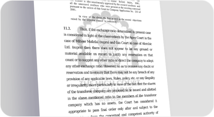 COMP/135/2011 41/49 ORDER will be detrimental to their interest." In the facts of the instant case also, the aforesaid exchange ratio and the other features of the Scheme of Arrangement and Restructure have been accepted by an overwhelming majority of shareholders (90.85% in number and 99.32% in value) out of the shareholders who responded to the postal ballot under the Companies (Passing of Resolutions by Postal Ballot) Rules, 2001. The scheme is also unanimously approved by the secured creditors and all the unsecured creditors who were present at the meeting convened pursuant to the orders of this Court in Company Application No. 213 of 2001. In view of the above, the first as well as the second objections raised by the objector cannot be sustained.” 11.3. Thus, if the exchange ratio determined in present case is considered in light of the observations by the Apex Court in the case of Miheer Mafatlal (supra) and this Court in case of Alembic Ltd. (supra) then there does not appear to be any ground or material available on record to justify any reservation on that count or to suggest any other ratio or direct the company to adopt any other exchange ratio. However, so as to remove any doubt or reservation and to ensure that there may not be any breach of any provision of any applicable laws, Rules, policy, etc. or any illegality or irregularity, more particularly in view of the fact that the shares of the transferee company are proposed to be issued and allotted in the above mentioned ratio to the members of the transferor company which has no assets, the Court has considered it appropriate to pass final order only after and subject to the reports/views from the concerned and competent authority of Income Tax and Enforcement Directorate and upon compliance of the clarifications and directions mentioned in present order. 11.4. The Court is conscious of the fact that the Court cannot probe deeper into the object and purpose of the Downloaded on : Fri Jan 27 19:33:28 IST 2023