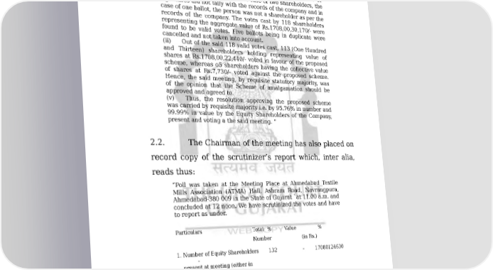 COMP/135/2011 3/49 ORDER representatives), 124 shareholders representing Rs.1708,00,37,700/- as the aggregate value of their shares, had cast their votes and 8 shareholders representing Rs.86,930/- as the value of their shares, abstained from voting. Out of 124 votes, 6 votes collectively representing Rs.7,530/- were declared invalid. The reasons for treating them invalid were: three of them had not marked their vote in favour or against the proposed scheme. In case of two shareholders, the signatures did not tally with the records of the company and in case of one ballot, the person was not a shareholder as per the records of the company. The votes cast by 118 shareholders representing the aggregate value of Rs.1708,00,30,170/- were found to be valid votes. Five ballots being in duplicate were cancelled and not taken into account. (ii) Out of the said 118 valid votes cast, 113 (One Hundred and Thirteen) shareholders holding representing value of shares at Rs.1708,00,22,440/- voted in favour of the proposed scheme, whereas o5 shareholders having the collective value of shares at Rs.7,730/- voted against the proposed scheme. Hence, the said meeting, by requisite statutory majority, was of the opinion that the Scheme of amalgamation should be approved and agreed to. (v) Thus, the resolution approving the proposed scheme was carried by requisite majority i.e. by 95.76% in number and 99.99% in value by the Equity Shareholders of the Company, present and voting a the said meeting. “ 2.2. The Chairman of the meeting has also placed on record copy of the scrutinizer’s report which, inter alia, reads thus: “Poll was taken at the Meeting Place at Ahmedabad Textile Mills Association (ATMA) Hall, Ashram Road, Navrangpura, Ahmedabad-380 009 in the State of Gujarat `at 11.00 a.m. and concluded at 12 noon. We have scrutinized the votes and have to report as under. Particulars Total % Value % Number (in Rs.) 1. Number of Equity Shareholders 132 - 17080124630 - present at meeting (either in person or through proxy) 2. Ballot Paper issued (including 5 duplicate issued against 5 cancelled) 137 -17080124630 - 3. Ballot Paper received 124 -17080124630 - 4. Members Abstained from Voting, if any 8 - 86930 - 5. Invalid Votes, if any 6 - 7530 - 6. Valid Votes Cast 118 100.00 17080030170 100 (a) Votes cast in favour of Resolution 113 95.76 17080022440 99.99 Downloaded on : Fri Jan 27 19:33:28 IST 2023