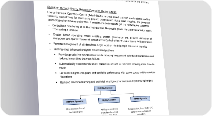 – Improving plant performance by deploying Data Analytics and associated analytical tools. – Underwater sea water pipeline inspection & desilting by Robot AIMSL handles the technology enabled operational excellence for Adani portfolio power plants where it centrally monitors all thermal stations, renewable power plant and substation assets from a single location. It has a cluster based operating model enabling smooth governance and efficient utilization of manpower and spares. Operation through Energy Network Operation Centre (ENOC): Energy Network Operation Centre (Adani-ENOC), a cloud-based platform which adopts machine learning, uses drones for monitoring project progress and digital asset mapping, and geospatial technologies for surveys and others. It enables the businesses to get the following key outcomes: – Centralized monitoring of all thermal stations, Renewable power plant and transmission assets from a single location – Cluster based operating model enabling smooth governance and efficient utilization of manpower and spares: Personnel spread across Central office → Cluster teams → Site personnel – Remote management of all sites from single location - to help rapid scale-up of capacity – Cutting-edge advanced analytics cloud-based platform ▪ Provides predictive maintenance inputs reducing frequency of scheduled maintenance and reduced mean time between failure ▪ Automatically recommends smart corrective actions in real time reducing mean time to repair ▪ Detailed insights into plant and portfolio performance with access across multiple devices /locations ▪ Backend machine learning and artificial Intelligence for continuously improving insights ENOC Capabilities ENOC as a Gateway: Facilitating Intelligent & Data Driven Decision making – Deliver crisp Business MIS to all users – Creation of CXO dashboards with management takeaways – Automation of Energy Business flash report & internal MIS 412