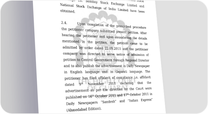 COMP/135/2011 4/49 ORDER (b) Votes cast against the Resolution 5 4.24 7730 0.01” 2.3. The petitioner company has also claimed that necessary approval and permission from concerned Stock Exchange i.e. Bombay Stock Exchange Limited and National Stock Exchange of India Limited have been obtained. 2.4. Upon completion of the prescribed procedure the petitioner company submitted present petition. After hearing the petitioner and upon considering the details mentioned in the petition, the petition came to be admitted by order dated 22.09.2011 and the petitioner company was directed to serve notice of admission of petition to Central Government through Regional Director and to also publish the advertisement in Daily Newspaper in English language and in Gujarati language. The petitioner has filed affidavit of compliance i.e. affidavit th dated 9 November 2011 declaring that the advertisement as per the direction by the Court were th th published on 16 October 2011 and 17 October 2011 in Daily Newspapers “Sandesh” and “Indian Express” (Ahmedabad Edition). 2.5. The record shows that in response to the advertisement two Shareholders viz. Mr. Bhupendra Gandhi and Mr. Rupesh S. Shah have filed objection in the office of Registrar of Companies/Regional Director. So far as the objections raised by the two shareholders are Downloaded on : Fri Jan 27 19:33:28 IST 2023