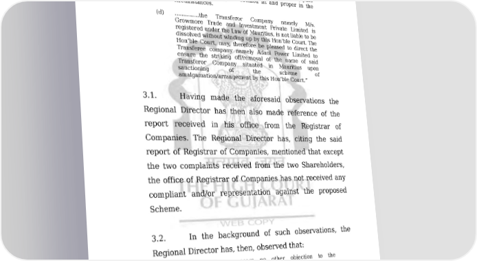 COMP/135/2011 7/49 ORDER this Hon’ble Court by filing appropriate affidavit/application in the present proceedings of the Scheme presented by the Petitioner company. (c) ……….However, the meeting of the Creditors of the Transferee company have not been directed by this Hon’ble Court. This Hon’ble Court may, however, pass such orders as may be deemed fit and proper in the circumstances. (d) …………..the Transferor Company namely M/s. Growmore Trade and Investment Private Limited is registered under the Law of Mauritius, is not liable to be dissolved without winding up by this Hon’ble Court. The Hon’ble Court, may, therefore be pleased to direct the Transferee company namely Adani Power Limited to ensure the striking off/removal of the name of said Transferor Company situated in Mauritius upon sanctioning of the scheme of amalgamation/arrangement by this Hon’ble Court.” 3.1. Having made the aforesaid observations the Regional Director has then also made reference of the report received in his office from the Registrar of Companies. The Regional Director has, citing the said report of Registrar of Companies, mentioned that except the two complaints received from the two Shareholders, the office of Registrar of Companies has not received any compliant and/or representation against the proposed Scheme. 3.2. In the background of such observations, the Regional Director has, then, observed that: “2(f) …………there appears no other objection to the proposed scheme of amalgamation of M/s. Growmore Trade and Investment Private United (Mauritius) with the Petitioner Transferee company here in this present Petition and registered in India and the scheme does not, prima facie appear to be prejudicial to the interest of the shareholders of the Petitioner Transferee Company and the public at large.” Downloaded on : Fri Jan 27 19:33:28 IST 2023