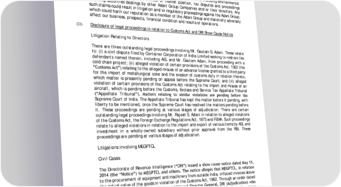 of smart meters to more accurately measure power consumption and enhance the efficiency and accuracy of our meter reading and bill distribution process. Any similar investigations or other proceedings in the future could divert management time and attention, and consume financial resources in their defense. Further, an adverse judgment in some of these proceedings could have a material adverse effect on our business, prospects, reputation, financial condition and results of operations. For further details, see “Legal Proceedings”. In addition, other Adani Group Companies from time to time are involved in litigation, claims and other proceedings relating to the conduct of their businesses, including environmental claims, proceedings relating to abuse of market position, tax disputes and proceedings involving securities dealings by other Adani Group Companies and/or their directors. Any such claims could result in litigation and/or regulatory proceedings against the Adani Group, which could harm our reputation as a member of the Adani Group and materially adversely affect our business, prospects, financial condition and results of operations. (D) Disclosure of legal proceedings in relation to Customs Act and DRI Show Cause Notice Litigation Relating to Directors There are three outstanding legal proceedings involving Mr. Gautam S. Adani. These relate to: (i) a civil dispute filed by Container Corporation of India Limited seeking to restrain the defendants named therein, including AEL and Mr. Gautam Adani, from proceeding with a cold chain project; (ii) alleged violation of certain provisions of the Customs Act, 1962 (the “Customs Act”) relating to the alleged misuse of an advance license granted to a third party for the import of metallurgical coke and the evasion of customs duty in relation thereto, which matter is presently pending on appeal before the Supreme Court; and (iii) alleged violation of certain provisions of the Customs Act relating to the import and misuse of an aircraft, which is pending before the Customs, Excises and Service Tax Appellate Tribunal (“Appellate Tribunal”). Matters relating to similar violations are pending before the Supreme Court of India. The Appellate Tribunal has kept the matter before it pending, with liberty to be mentioned, once the Supreme Court has resolved the matters pending before it. These proceedings are pending at various stages of adjudication. There are certain outstanding legal proceedings involving Mr. Rajesh S. Adani in relation to alleged violations of the Customs Act, the Foreign Exchange Regulations Act, 1973 and FEMA. Such proceedings relate to alleged violations in relation to the import and export of various items by AEL and investment in a wholly-owned subsidiary without prior approval from the RBI. These proceedings are pending at various stages of adjudication. Litigations involving MEGPTCL Civil Cases The Directorate of Revenue Intelligence (“DRI”) issued a show cause notice dated May 15, 201 (the “Notice”) to ME PTCL and others. The notice alleges that ME PTCL, in relation to the procurement of equipment and machinery from outside India, inflated invoices above the actual value of the goods in violation of the Customs Act, 1962. Through an order dated October 17, 2017 (the “Order”), the Additional Director eneral, DRI (Adjudication) who issued the show cause notice, after dealing with the issue in detail, set aside the allegations levelled in the Notice, holding that the import of equipment and machinery by MEGPTCL was undertaken on an arm’s length basis. The Customs Department has filed an appeal against the Order before the Customs, Excise and Service Tax Appellate Tribunal at Mumbai. No stay has presently been granted against the Order. This matter is currently pending. (III) Offering circular dated February 5, 2020 for U.S.$1,000,000,000 Senior Secured Notes by Adani Electricity Mumbai Limited 62