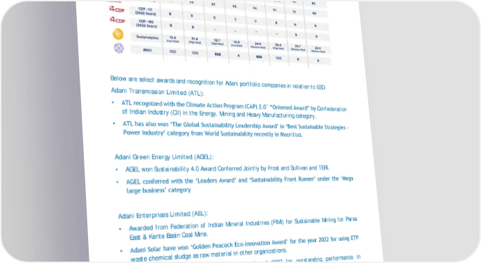 Below are select awards and recognition for Adani portfolio companies in relation to ESG Adani Transmission Limited (ATL): • ATL recogni ed with the Climate Action Program (CAP) 2.0° “Oriented Award” by Confederation of Indian Industry (CII) in the Energy, Mining and Heavy Manufacturing category. • ATL has also won ‘The lobal Sustainability Leadership Award’ in ‘Best Sustainable Strategies - Power Industry’ category from World Sustainability recently in Mauritius. Adani Green Energy Limited (AGEL): • AGEL won Sustainability 4.0 Award Conferred Jointly by Frost and Sullivan and TERI. • A EL conferred with the ‘Leaders Award’ and ‘Sustainability Front Runner’ under the ‘Mega large business’ category Adani Enterprises Limited (AEL): • Awarded from Federation of Indian Mineral Industries (FIMI) for Sustainable Mining for Parsa East & Kente Basin Coal Mine. • Adani Solar have won ‘ olden Peacock Eco-Innovation Award’ for the year 2022 for using ETP waste chemical sludge as raw material in other organizations. • Guwahati Airport awarded the Greentech Award 2022 for outstanding performance in environment and sustainability category. Adani Total Gas Limited (ATGL): • The Economic Times Biggest Initiative on the Gas Sector, ET Energyworld Annual Gas Conclave, facilitated Adani Total as Limited for the Category “ES initiative of the year” for Greenmosphere - Low Carbon society. 53