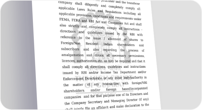 COMP/135/2011 9/49 ORDER winding up and remove the company from its Register. I clarify that the Scheme does not contemplate that the Transferor Company shall be dissolved by an order of this Hon’ble Court. 3.4. However, with a view to removing any doubt, it is, hereby directed that the petitioner and the transferor company shall diligently and completely comply all applicable Laws Rules and Regulations including all applicable provisions, conditions and requirements under FEMA, FERA and RBI Act and Companies Act and shall also strictly and completely comply all instructions - directions and guidelines issued by the RBI with reference to the issue / allotment of shares to Foreign/Non Resident Indian shareholders and subscribers and also regarding the process of amalgamation and obtain all necessary permissions, licences, authorization etc. as may be required and that it shall comply all directions, guidelines and instructions issued by RBI and/or Income Tax Department and/or Enforcement Directorate or any other body/authority in the matter of any transaction with foreign/NRI shareholders and/or foreign based/incorporated companies and for that purpose one of its Directors and the Company Secretary and Managing Director (if any) shall jointly file an affidavit and make declaration to the said effect that it shall comply. 3.5. In view of such stipulation, assurance and declaration by the company in its above referred affidavit and in light of the above direction, the observations and Downloaded on : Fri Jan 27 19:33:28 IST 2023