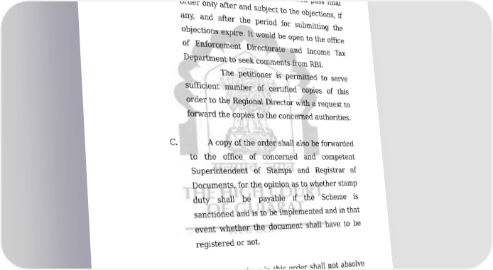 COMP/135/2011 45/49 ORDER sanctioned, will result into and/or is/are likely to result into breach of any provision of any applicable Acts including the Income Tax Act and Companies Act. The Court shall pass final order only after and subject to the objections, if any, and after the period for submitting the objections expire. It would be open to the office of Enforcement Directorate and Income Tax Department to seek comments from RBI. The petitioner is permitted to serve sufficient number of certified copies of this order to the Regional Director with a request to forward the copies to the concerned authorities. C. A copy of the order shall also be forwarded to the office of concerned and competent Superintendent of Stamps and Registrar of Documents, for the opinion as to whether stamp duty shall be payable if the Scheme is sanctioned and is to be implemented and in that event whether the document shall have to be registered or not. D. The observations in this order shall not absolve and/or release and/or exempt and/or protect (and/or provide any type of protection to) the companies, and/or the promoters and/or the officers and/or the executives and/or the directors and/or any responsible/ accountable Downloaded on : Fri Jan 27 19:33:28 IST 2023