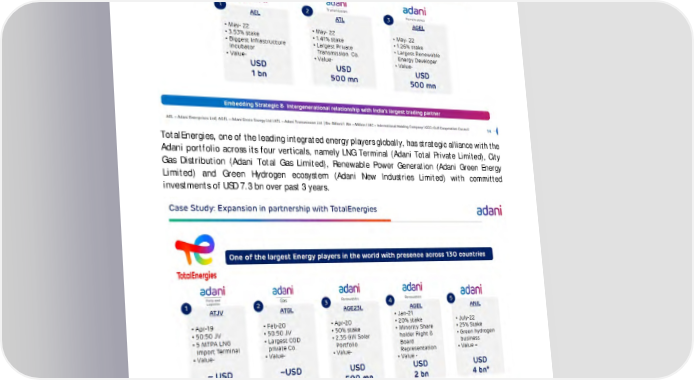TotalEnergies, one of the leading integrated energy players globally, has strategic alliance with the Adani portfolio across its four verticals, namely LNG Terminal (Adani Total Private Limited), City Gas Distribution (Adani Total Gas Limited), Renewable Power Generation (Adani Green Energy Limited) and Green Hydrogen ecosystem (Adani New Industries Limited) with committed investments of USD 7.3 bn over past 3 years. Adani has also successfully concluded the IPO of portfolio FMCG company AWL (Adani Wilmar Limited) amounting to INR 36 bn (USD 450 mn) during the month of February 2022. 13