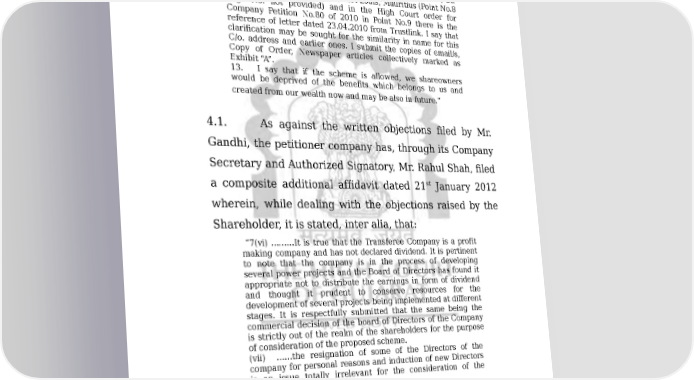 COMP/135/2011 11/49 ORDER wholly owned subsidiary (Point No.12). I say that APML has not shown any profits for 31st March 2011. I say the proposal for amalgamation is done in haste and may be with high valuation for the Company APML shares as the APML project is yet to take off. 12. I say that the Registered office address of Growmore is shown as C/o. Trust Link International Limited, Suite 501, St. James Court, St. Denis Street, Port Louis, Mauritius (Point No.8 Page No. not provided) and in the High Court order for Company Petition No.80 of 2010 in Point No.9 there is the reference of letter dated 23.04.2010 from Trustlink. I say that clarification may be sought for the similarity in name for this C/o. address and earlier ones. I submit the copies of email/s, Copy of Order, Newspaper articles collectively marked as Exhibit “A”. 13. I say that if the scheme is allowed, we shareowners would be deprived of the benefits which belongs to us and created from our wealth now and may be also in future.” 4.1. As against the written objections filed by Mr. Gandhi, the petitioner company has, through its Company Secretary and Authorized Signatory, Mr. Rahul Shah, filed st a composite additional affidavit dated 21 January 2012 wherein, while dealing with the objections raised by the Shareholder, it is stated, inter alia, that: “7(vi) ………It is true that the Transferee Company is a profit making company and has not declared dividend. It is pertinent to note that the company is in the process of developing several power projects and the Board of Directors has found it appropriate not to distribute the earnings in form of dividend and thought it prudent to conserve resources for the development of several projects being implemented at different stages. It is respectfully submitted that the same being the commercial decision of the board of Directors of the Company is strictly out of the realm of the shareholders for the purpose of consideration of the proposed scheme. (vii) ……the resignation of some of the Directors of the company for personal reasons and induction of new Directors is an issue totally irrelevant for the consideration of the proposed Scheme. (viii) ……..the Exchange ratio was worked out on the basis of the Valuation undertaken by Ernst & Young Private Limited, an independent valuer. The same was duly approved by the Board of Directors and the majority of shareholders at the meeting. It is pertinent to note that the concerned Stock Exchanges viz. BSE and NSE did not find the same objectionable or against the interest of the shareholders. It is also pertinent to note that apart from the bald allegation that the valuation is unfair, the said shareholder has not been in a Downloaded on : Fri Jan 27 19:33:28 IST 2023