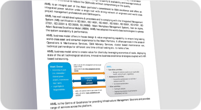 Annexure 11: Details about AIMSL Adani Infrastructure Management Services Limited (AIMSL) has implemented the practices to achieve business excellence by focusing on systematic and structured way of operational & maintenance that leads Adani portfolio companies towards its asset’s performance improvement. AIMSL is one stop shop for all O&M needs for renewable power plants (Solar & Wind), transmission system & thermal power plants ensuring a very high reliability & availability and leverage tenets of operational excellence to reduce the O&M costs without compromising on the quality. AIMSL is an integral part of the Adani portfolio’s commitment to O M excellence and offers an integrated power solution under a single roof with strong network of engineers and world class project management professionals and O&M experts. AIMSL has well established systems & processes and is complying with the Integrated Management System (IMS) certification in ISO 9001, ISO 14001, ISO 45001, ISO 50001, ISO 55001, ISO 27001, ISO 27031, ISO 22301 & ISO 26000, 5S (AWMS - Adani Workplace Management System), lean six sigma, Adani Business Excellence Model (ABEM). AIMSL has adopted the world class technologies to upkeep the system availability & performance. AIMSL business model offers in-house design & value engineering capability to ensure long-lasting world-class asset and consumer experience to the Adani Portfolio. It offers services in the areas of Operations & Maintenance Services, O&M Advisory Services, cluster based maintenance van, technical partnerships for different one time critical testing etc. to name a few. AIMSL business model aims to create value for clients by leveraging economies of scale, deploying state of the art technological solutions, innovative business excellence strategies coupled with KPI based outsourcing. AIMSL is the Centre of Excellence for providing Infrastructure Management Solutions and provides range of services across the platform, 410