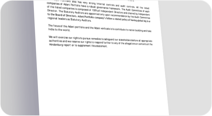 issued to him by the judge because he failed to appear before the court despite summons and was not complying with the judicial process. V. OUR COMMITMENT TO HIGHEST LEVELS OF COMPLIANCE AND CONTINUED GROWTH We reaffirm that we are in compliance with all applicable laws and regulations. We are committed to the highest levels of governance to protect the interests of all our stakeholders. The Adani Portfolio also has very strong internal controls and audit controls. All the listed companies of Adani Portfolio have a robust governance framework. The Audit Committee of each of the listed companies is composed of 100% of Independent Directors and chaired by Independent Director. The Statutory Auditors are appointed only upon recommendation by the Audit Committee to the Board of Directors. Adani Portfolio company’s follow a stated policy of having global big 6 or regional leaders as Statutory Auditors. The focus of the Adani portfolio and the Adani verticals is to contribute to nation building and take India to the world. We will exercise our rights to pursue remedies to safeguard our stakeholders before all appropriate authorities and we reserve our rights to respond further to any of the allegations or contents of the Hindenburg report or to supplement this statement. 7