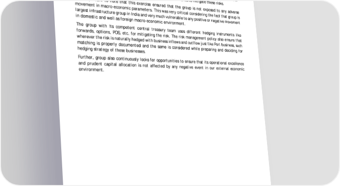To enhance the risk management and mitigation of various identified risks, during the current financial year (FY23) the group has undertaken detailed exercise of preparing and implementing the hedge policy for different businesses with the help of external expert The group identified different financial risk in the nature of interest rate risk, foreign exchange risk, asset liability maturity mismatches, commodity price risk, credit risk and various other risks for each business. After understanding of different risks in different value chains with plethora of discussion, the group implemented various tools and instruments to mitigate these risks. It is important to note that this exercise ensured that the group is not exposed to any adverse movement in macro-economic parameters. This was very critical considering the fact that group is largest infrastructure group in India and very much vulnerable to any positive or negative movement in domestic and well as foreign macro-economic environment. The group with its competent central treasury team uses different hedging instruments like forwards, options, POS, etc. for mitigating the risk. The risk management policy also ensure that wherever the risk is naturally hedged with business inflows and outflow just like Port business, such matching is properly documented and the same is considered while preparing and deciding for hedging strategy of these businesses. Further, group also continuously looks for opportunities to ensure that its operational excellence and prudent capital allocation is not affected by any negative event in our external economic environment. 26