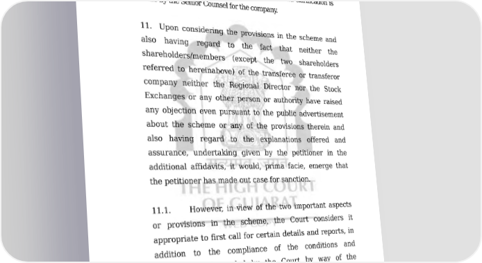 COMP/135/2011 38/49 ORDER clarified that except the objections by two shareholders (of which reference has been made in present order) any other objections from any member or creditor have not been received in the office of Registrar of Companies. Similar declaration and clarification is made by the Senior Counsel for the company. 11. Upon considering the provisions in the scheme and also having regard to the fact that neither the shareholders/members (except the two shareholders referred to hereinabove) of the transferee or transferor company neither the Regional Director nor the Stock Exchanges or any other person or authority have raised any objection even pursuant to the public advertisement about the scheme or any of the provisions therein and also having regard to the explanations offered and assurance, undertaking given by the petitioner in the additional affidavits, it would, prima facie, emerge that the petitioner has made out case for sanction. 11.1. However, in view of the two important aspects or provisions in the scheme, the Court considers it appropriate to first call for certain details and reports, in addition to the compliance of the conditions and requirement demanded by the Court by way of the direction in present order, before taking final decision and before passing final order. In view of the law laid down by the Apex Court about the Court's role and scope of examination in the matter of arrangement or amalgamation, the Court is conscious about the limitation Downloaded on : Fri Jan 27 19:33:28 IST 2023