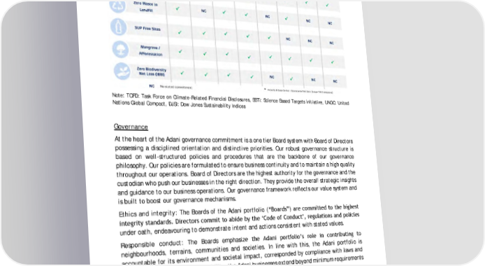 Key Environmental commitments of Adani Portfolio companies Note: TCFD: Task Force on Climate-Related Financial Disclosures, SBTi: Science Based Targets initiative, UNGC: United Nations Global Compact, DJSI: Dow Jones Sustainability Indices Governance At the heart of the Adani governance commitment is a one tier Board system with Board of Directors possessing a disciplined orientation and distinctive priorities. Our robust governance structure is based on well-structured policies and procedures that are the backbone of our governance philosophy. Our policies are formulated to ensure business continuity and to maintain a high quality throughout our operations. Board of Directors are the highest authority for the governance and the custodian who push our businesses in the right direction. They provide the overall strategic insights and guidance to our business operations. Our governance framework reflects our value system and is built to boost our governance mechanisms. Ethics and integrity: The Boards of the Adani portfolio (“Boards”) are committed to the highest integrity standards. Directors commit to abide by the ‘Code of Conduct’, regulations and policies under oath, endeavouring to demonstrate intent and actions consistent with stated values. Responsible conduct: The Boards emphasize the Adani portfolio’s role in contributing to neighbourhoods, terrains, communities and societies. In line with this, the Adani portfolio is accountable for its environment and societal impact, corresponded by compliance with laws and regulations. As a mark of responsibility, the Adani businesses extend beyond minimum requirements with the objective of emerging as a responsible corporate. Accountability and transparency: The Boards engage in comprehensive financial and nonfinancial reporting, aligned to best practices relating to disclosures; it follows internal and/or external assurance and governance procedures Structure of the board: All Adani portfolio entities’ Board represents an appropriate balance between executive, non-executive and independent directors to safeguard the interests of 18
