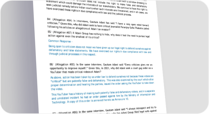 We have already addressed above all allegations in respect of DRI investigations, which as detailed above have been closed and dismissed in our favour. F. Biased and unsubstantiated rhetoric Biased and unsubstantiated rhetoric: Allegation no. 84, 85, 86, 87, and 88 from the report are inherently biased statements around our openness to address criticism with a window-dressing to garb them as questions. Criticism does not include the right to make false and defamatory statement which could damage the interests of our stakeholders. We continue to have the right to seek judicial remedy before Indian courts when such interests are threatened, and in all cases, we have exercised these rights in due compliance with law and the judicial process. 84/ (Allegation #84) In interviews, autam Adani has said “I have a very open mind toward criticism.” iven this, why did Adani seek to have critical journalist Paranjoy uha Thakutra jailed following his articles on allegations of Adani tax evasion? 85/ (Allegation #87) If Adani Group has nothing to hide, why does it feel the need to pursue legal action against even the smallest of its critics? Common Response - Being open to criticism does not mean we have given up our legal right to defend ourselves against defamatory and false statements. We have exercised our rights in due compliance with law and through judicial processes in this respect. 86/ (Allegation #85) In the same interview, autam Adani said “Every criticism gives me an opportunity to improve myself.” iven this, in 2021, why did Adani seek a court gag order on a YouTuber that made critical videos of Adani? As above, action has been taken by us under law to defend ourselves not because these videos are “critical” but are patently false and defamatory. This was also examined by the court which after proper determination and hearing the parties, issued the order asking the YouTuber to take down the video. This YouTuber has a history of making such patently false and defamatory videos, and in a separate and unrelated incident he had an order passed against him by the Ministry of Information and Technology. A copy of this order is annexed hereto as Annexure 10. 87/ (Allegation #86) In the same interview, autam Adani said “I always introspect and try to understand the others’ point of view.” iven this, why has Adani roup filed legal suits against journalists and activists, which have been condemned by media watchdogs? Why did it have an activist in Australia followed by private investigators? Being open to introspection or understanding others point of view does not mean we have given up our legal right to defend ourselves, our businesses and other employees through proper legal channels. We have exercised our rights in this matter in due compliance with law and through proper judicial processes in this respect. 51