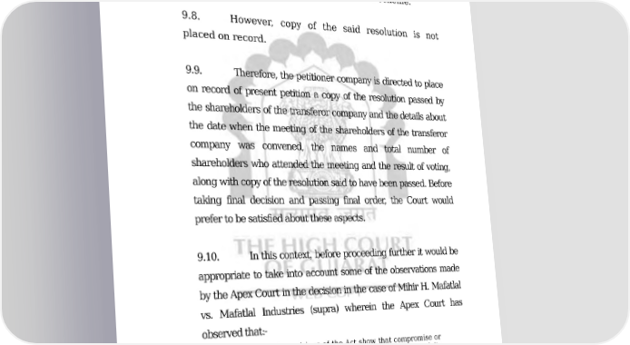 COMP/135/2011 31/49 ORDER transferor company which is mentioned in the scheme is that the said transferor company has passed resolution approving the scheme and the shareholders of the transferor company have also approved the scheme. 9.8. However, copy of the said resolution is not placed on record. 9.9. Therefore, the petitioner company is directed to place on record of present petition a copy of the resolution passed by the shareholders of the transferor company and the details about the date when the meeting of the shareholders of the transferor company was convened, the names and total number of shareholders who attended the meeting and the result of voting, along with copy of the resolution said to have been passed. Before taking final decision and passing final order, the Court would prefer to be satisfied about these aspects. 9.10. In this context, before proceeding further it would be appropriate to take into account some of the observations made by the Apex Court in the decision in the case of Mihir H. Mafatlal vs. Mafatlal Industries (supra) wherein the Apex Court has observed that:- “The aforesaid provisions of the Act show that compromise or arrangement can be proposed between a company and its creditors or any class of them, or between a company and its members or any class of them. Such a compromise would also take in its sweep any scheme of amalgamation/merger of one company with another. When such a scheme is put forward by a company for the sanction of the Court in the first instance the Court has to direct holding of meetings of creditors or class of creditors, or members or class of members who are concerned with such a scheme and once the majority in number representing three fourths in value of creditors of Downloaded on : Fri Jan 27 19:33:28 IST 2023