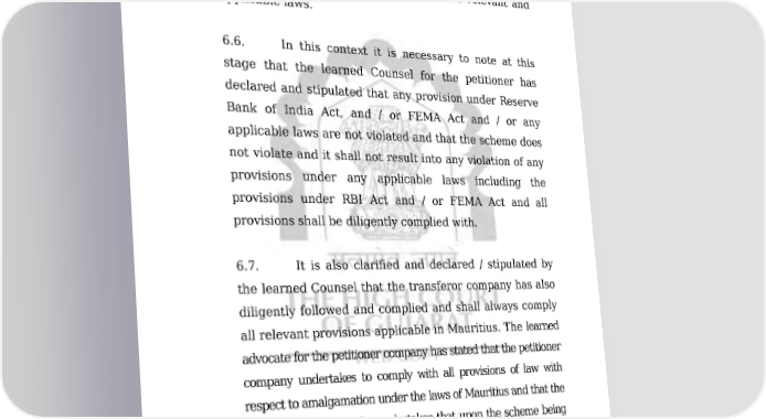 COMP/135/2011 24/49 ORDER have to obtain, before the scheme can be implemented, all types and categories of permission, approval, licences, consents, etc. from all concerned and appropriate authorities, as may be necessary under the relevant and applicable laws. 6.6. In this context it is necessary to note at this stage that the learned Counsel for the petitioner has declared and stipulated that any provision under Reserve Bank of India Act, and / or FEMA Act and / or any applicable laws are not violated and that the scheme does not violate and it shall not result into any violation of any provisions under any applicable laws including the provisions under RBI Act and / or FEMA Act and all provisions shall be diligently complied with. 6.7. It is also clarified and declared / stipulated by the learned Counsel that the transferor company has also diligently followed and complied and shall always comply all relevant provisions applicable in Mauritius. The learned advocate for the petitioner company has stated that the petitioner company undertakes to comply with all provisions of law with respect to amalgamation under the laws of Mauritius and that the petitioner company also undertakes that upon the scheme being sanctioned by this Court, the petitioner company shall take necessary steps for getting the names of the amalgamating companies (Transferor Companies) struck-off in accordance with the Companies Act, 2001 as applicable in Mauritius. Downloaded on : Fri Jan 27 19:33:28 IST 2023