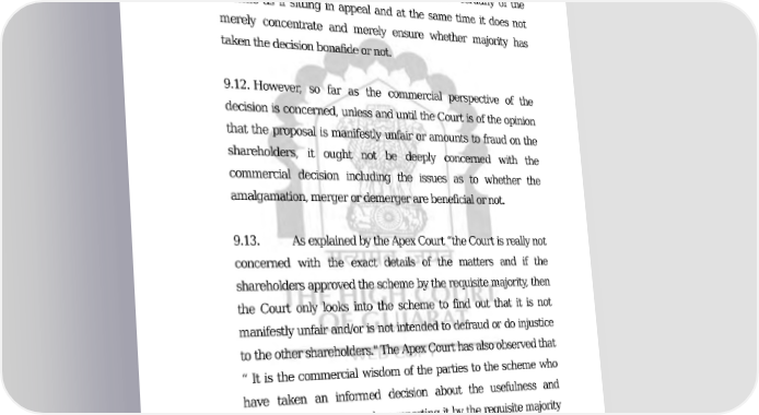 COMP/135/2011 35/49 ORDER light of the observations by the Apex Court in the above referred judgment and while keeping in focus that the Court has to balance the examination or the scrutiny of the scheme in such a way that it does not take up the examination – scrutiny of the scheme as if sitting in appeal and at the same time it does not merely concentrate and merely ensure whether majority has taken the decision bonafide or not. 9.12. However, so far as the commercial perspective of the decision is concerned, unless and until the Court is of the opinion that the proposal is manifestly unfair or amounts to fraud on the shareholders, it ought not be deeply concerned with the commercial decision including the issues as to whether the amalgamation, merger or demerger are beneficial or not. 9.13. As explained by the Apex Court “the Court is really not concerned with the exact details of the matters and if the shareholders approved the scheme by the requisite majority, then the Court only looks into the scheme to find out that it is not manifestly unfair and/or is not intended to defraud or do injustice to the other shareholders." The Apex Court has also observed that “ It is the commercial wisdom of the parties to the scheme who have taken an informed decision about the usefulness and propriety of the scheme by supporting it by the requisite majority vote that has to be kept in view by the Court and the Court certainly would not act as a Court of appeal and sit in judgment over the informed view.” The Apex Court has also observed that “the Court has neither the expertise nor the jurisdiction to delve deep into the commercial wisdom exercised by the creditors and Downloaded on : Fri Jan 27 19:33:28 IST 2023