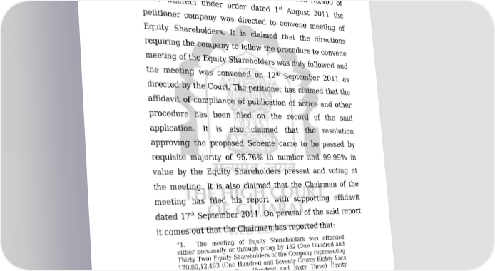 COMP/135/2011 2/49 ORDER Court, St. Denis Street, Port Louis, Mauritius. 2.1. Before taking out present petition the petitioner company had taken out Company Application No.400 of st 2011 wherein under order dated 1 August 2011 the petitioner company was directed to convene meeting of Equity Shareholders. It is claimed that the directions requiring the company to follow the procedure to convene meeting of the Equity Shareholders was duly followed and th the meeting was convened on 12 September 2011 as directed by the Court. The petitioner has claimed that the affidavit of compliance of publication of notice and other procedure has been filed on the record of the said application. It is also claimed that the resolution approving the proposed Scheme came to be passed by requisite majority of 95.76% in number and 99.99% in value by the Equity Shareholders present and voting at the meeting. It is also claimed that the Chairman of the meeting has filed his report with supporting affidavit th dated 17 September 2011. On perusal of the said report it comes out that the Chairman has reported that: “1. The meeting of Equity Shareholders was attended either personally or through proxy by 132 (One Hundred and Thirty Two) Equity Shareholders of the Company representing 170,80,12,463 (One Hundred and Seventy Crores Eighty Lacs Twelve Thousand Four Hundred and Sixty Three) Equity Shares aggregating to Rs.17,08,01,24,630/- (Rupees Seventeen Hundred and Eight Crores One Lac Twenty Four thousand Six Hundred and Thirty only) comprising of 53 (Fifty Three) Equity Shareholders in person, 2 (Two) through the Authorised Representatives and 77 (Seventy Seven) Equity Shareholders through proxy. 3. The result of the voting upon the said question was as follows: (i) Out of 132 shareholders who have attended the meeting (either in person or by proxy or through Authorised Downloaded on : Fri Jan 27 19:33:28 IST 2023