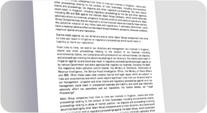 (V) Offering circular dated July 26, 2021 for USD 750 Million issued by ASPEZ (A) DRI Disclosure Certain Adani Group Companies are involved in various legal, regulatory and other proceedings which could have a material adverse effect on our business and reputation. Certain Adani Group Companies from time to time are involved in litigation, claims and other proceedings relating to the conduct of their businesses, including environmental claims and proceedings, tax disputes and other regulatory proceedings. Any such claims could result in litigation, including regulatory proceedings by the GoI and other agencies including DRI and SEBI against the relevant Adani Group Company, which could materially adversely affect our business, prospects, financial condition and results of operations. Adani Group Companies may also be required to utilize financial resources towards these matters. Any potential violation of any Indian laws and regulations, if adversely determined, could have a material adverse effect on the Adani roup’s business, prospects, financial condition, results of operations and reputation. Claims made against us, our directors and/or other Adani Group companies from time to time can result in litigation or regulatory proceedings which could result in liability or harm our reputation. From time to time, we and/or our directors and management are involved in litigation, claims and other proceedings relating to the conduct of our business, including environmental claims, non-compliance with provisions of our various licenses, tax disputes, and proceedings involving the securities dealings of our directors. Any claims could result in litigation against us and could also result in regulatory proceedings being brought against us by various Government and state agencies that regulate our business, including the MoEF, the respective state pollution control boards, the Ministry of Commerce, Directorate of Revenue Intelligence, the Serious Fraud Investigation Office, the Ministry of Home Affairs and SEBI. Often these cases raise complex factual and legal issues, which are subject to risks and uncertainties and which could require significant time from our directors and/or our management. Litigation and other claims and regulatory proceedings against us or our management could result in unexpected expenses and liability and could also materially adversely affect our operations and our reputation. For further details, see “Legal Proceedings”. Adani Group companies from time to time are involved in litigation, claims and other proceedings relating to the conduct of their businesses, including environmental claims, proceedings relating to abuse of market position, tax disputes and proceedings involving securities dealings by other Adani Group companies and/or their directors. Any claims could result in litigation and/or regulatory proceedings against the Adani Group, which could harm our reputation as a member of the Adani Group and ultimately materially adversely affect our operations. (B) Disclosure referring SEBI and Indian securities market There may be less information available in the Indian securities markets than in more developed securities markets in other countries. There is a difference between the level of regulation and monitoring of the Indian securities markets and that of the activities of investors, brokers and other participants in securities 65