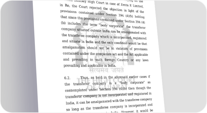 COMP/135/2011 22/49 ORDER Essar Shipping Port and Logistic Limited in Re wherein the Court in the decision dated 16.1.2009 in Company Petition No. 280 of 2008 in Company Application No.490 of 2008 considered similar objection and relying on the decision Bombay High Court in case of Zenta P. Limited, in Re, the Court rejected the objection in light of the provisions contained under Section 394 (4)(b) holding that since the provisions contained under Section 394 (4) (b) includes the term “body corporate” the transferor company situated outside India can be amalgamated with the transferee company which is incorporated, registered and situate in India and the only condition would be that amalgamation should not be in violation of provisions contained under the companies act and the Act applicable and prevailing in such foreign Country or any laws prevailing and applicable in India. 6.2. Thus, as held in the aforesaid earlier cases if the transferor company is a “body corporate” as contemplated under Section 394 (4)(b) then though the transferor company is not incorporated and registered in India, it can be amalgamated with the transferee company so long as the transferee company is incorporated and registered and situate in India. However, it would be subject to the condition that such amalgamation must not be in violation of the provision contained under Reserve Bank of India Act, 1934 and / or Foreign Exchange Management Act, 1999 and also the provision of the Companies Act or any other law. Such amalgamation also Downloaded on : Fri Jan 27 19:33:28 IST 2023