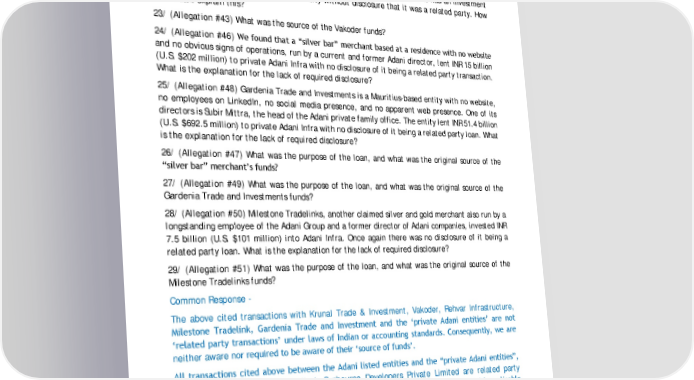21/ (Allegation #40) A Vinod Adani-controlled Mauritius entity now called Krunal Trade & Investment lent INR 11.71 billion (U.S. ~$253 million) to a private Adani entity without disclosure of it being a related party loan. How does Adani explain this? 22/ (Allegation #42) A Vinod Adani-controlled Cyprus entity called Vakoder Investments has no signs of employees, no substantive online presence, and no clear operations. It had an investment of U.S. ~$85 million in an Adani private entity without disclosure that it was a related party. How does Adani explain this? 23/ (Allegation #43) What was the source of the Vakoder funds? 24/ (Allegation #46) We found that a “silver bar” merchant based at a residence with no website and no obvious signs of operations, run by a current and former Adani director, lent INR 15 billion (U.S. $202 million) to private Adani Infra with no disclosure of it being a related party transaction. What is the explanation for the lack of required disclosure? 25/ (Allegation #48) Gardenia Trade and Investments is a Mauritius-based entity with no website, no employees on LinkedIn, no social media presence, and no apparent web presence. One of its directors is Subir Mittra, the head of the Adani private family office. The entity lent INR 51.4 billion (U.S. $692.5 million) to private Adani Infra with no disclosure of it being a related party loan. What is the explanation for the lack of required disclosure? 26/ (Allegation #47) What was the purpose of the loan, and what was the original source of the “silver bar” merchant’s funds? 27/ (Allegation #49) What was the purpose of the loan, and what was the original source of the Gardenia Trade and Investments funds? 28/ (Allegation #50) Milestone Tradelinks, another claimed silver and gold merchant also run by a longstanding employee of the Adani Group and a former director of Adani companies, invested INR 7.5 billion (U.S. $101 million) into Adani Infra. Once again there was no disclosure of it being a related party loan. What is the explanation for the lack of required disclosure? 29/ (Allegation #51) What was the purpose of the loan, and what was the original source of the Milestone Tradelinks funds? Common Response - The above cited transactions with Krunal Trade & Investment, Vakoder, Rehvar Infrastructure, Milestone Tradelink, ardenia Trade and Investment and the ‘private Adani entities’ are not ‘related party transactions’ under laws of Indian or accounting standards. Consequently, we are neither aware nor required to be aware of their ‘source of funds’. All transactions cited above between the Adani listed entities and the “private Adani entities”, i.e., Adani Estates Private Limited, Sunbourne Developers Private Limited are related party transactions, which have been undertaken on arm’s length terms and in compliance with applicable Indian laws and standard, and have also been fully disclosed as related party transactions. 30/ (Allegation #41) A Vinod Adani-controlled UAE entity called Emerging Market Investment DMCC lists no employees on LinkedIn, has no substantive online presence, has announced no clients or 35