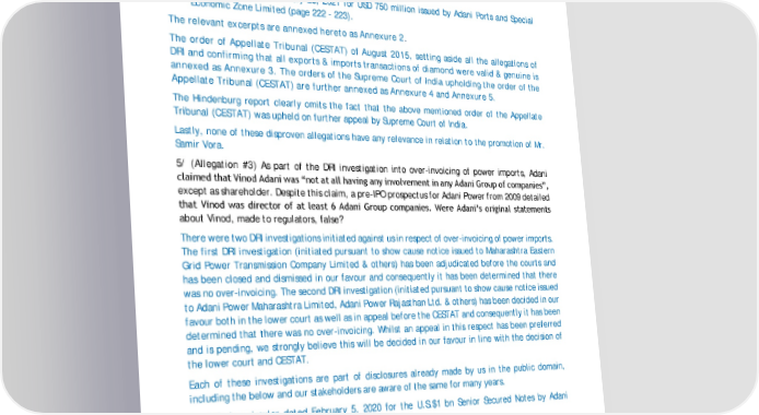 vi. Offering circular dated July 16, 2019 for USD 650 million Senior Secured Notes issued by Adani Ports and Special Economic Zone Limited (page 183), vii. Offering circular dated July 22, 2015 for USD 650 million issued by Adani Ports and Special Economic Zone Limited (page 172), viii. Offering circular dated June 22, 2017 for USD 500 million issued by Adani Ports and Special Economic Zone Limited (page 204), ix. Offering circular dated July 26, 2021 for USD 750 million issued by Adani Ports and Special Economic Zone Limited (page 222 - 223). The relevant excerpts are annexed hereto as Annexure 2. The order of Appellate Tribunal (CESTAT) of August 2015, setting aside all the allegations of DRI and confirming that all exports & imports transactions of diamond were valid & genuine is annexed as Annexure 3. The orders of the Supreme Court of India upholding the order of the Appellate Tribunal (CESTAT) are further annexed as Annexure 4 and Annexure 5. The Hindenburg report clearly omits the fact that the above mentioned order of the Appellate Tribunal (CESTAT) was upheld on further appeal by Supreme Court of India. Lastly, none of these disproven allegations have any relevance in relation to the promotion of Mr. Samir Vora. 5/ (Allegation #3) As part of the DRI investigation into over-invoicing of power imports, Adani claimed that inod Adani was “not at all having any involvement in any Adani roup of companies”, except as shareholder. Despite this claim, a pre-IPO prospectus for Adani Power from 2009 detailed that inod was director of at least 6 Adani roup companies. Were Adani’s original statements about Vinod, made to regulators, false? There were two DRI investigations initiated against us in respect of over-invoicing of power imports. The first DRI investigation (initiated pursuant to show cause notice issued to Maharashtra Eastern Grid Power Transmission Company Limited & others) has been adjudicated before the courts and has been closed and dismissed in our favour and consequently it has been determined that there was no over-invoicing. The second DRI investigation (initiated pursuant to show cause notice issued to Adani Power Maharashtra Limited, Adani Power Rajasthan Ltd. & others) has been decided in our favour both in the lower court as well as in appeal before the CESTAT and consequently it has been determined that there was no over-invoicing. Whilst an appeal in this respect has been preferred and is pending, we strongly believe this will be decided in our favour in line with the decision of the lower court and CESTAT. Each of these investigations are part of disclosures already made by us in the public domain, including the below and our stakeholders are aware of the same for many years. i. Offering circular dated February 5, 2020 for the U.S.$1 bn Senior Secured Notes by Adani Electricity Mumbai Limited (page 34), and ii. Offering circular dated July 13, 2021 for the U.S.$2 bn Global Medium Term Note Programme by Adani Electricity Mumbai Limited (page 53) iii. Offering circular dated July 28, 2016 for the U.S.$500 mn Senior Secured Notes issued by Adani Transmission Limited (page 37 and149) 28