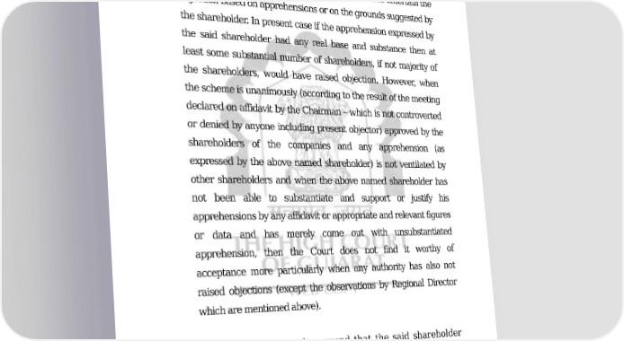 COMP/135/2011 20/49 ORDER Unless it is satisfactorily demonstrated that what is proposed in the scheme is a facade and the end result would be detrimental to or prejudicial to the interest of the shareholders and / or creditors, the Court would not be inclined to entertain the objection based on apprehensions or on the grounds suggested by the shareholder. In present case if the apprehension expressed by the said shareholder had any real base and substance then at least some substantial number of shareholders, if not majority of the shareholders, would have raised objection. However, when the scheme is unanimously (according to the result of the meeting declared on affidavit by the Chairman – which is not controverted or denied by anyone including present objector) approved by the shareholders of the companies and any apprehension (as expressed by the above named shareholder) is not ventilated by other shareholders and when the above named shareholder has not been able to substantiate and support or justify his apprehensions by any affidavit or appropriate and relevant figures or data and has merely come out with unsubstantiated apprehension, then the Court does not find it worthy of acceptance more particularly when any authority has also not raised objections (except the observations by Regional Director which are mentioned above). 5.1 Hence, not on the ground that the said shareholder is the only shareholder (or there are only 2 shareholders) raising objections against the scheme but on the ground that the objections are not substantiated and any material to take a different view, particularly contrary to the opinion given by the Registrar of Companies, the Regional Downloaded on : Fri Jan 27 19:33:28 IST 2023