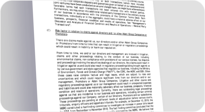 on our business, prospects, financial condition, results of operations and reputation. See also “Legal Proceedings — Litigation Relating to Subsidiaries — MEGPTCL”. (B) Risk factor in relation to material related party transactions We have material related party transactions and may continue to do so. We have entered into transactions with other Adani Group Companies in the ordinary course of our business. While we believe that all such transactions (which have included (unsecured) inter-corporate deposits and guarantees given on behalf of our subsidiaries and joint ventures) have been conducted on an arm’s length basis, we might have achieved more favorable terms had such transactions not been entered into with related parties. Furthermore, we may enter into additional related party transactions in the ordinary course of our business in accordance with the provisions of the Common Terms Deed. Such transactions, individually or in the aggregate, could have a material adverse effect on our business, prospects, financial condition and results of operations. See “Management’s Discussion and Analysis of Financial Condition and Results of Operations — Related Party Transactions”. (C) Risk factor in relation to claims against directors and /or other Adani Group Companies or Promoters There are claims made against us, our directors and/or other Adani Group Companies or Promoters from time to time that can result in litigation or regulatory proceedings which could result in liability or harm our reputation. From time to time, we and/or our directors and management are involved in litigation, claims and other proceedings relating to the conduct of our business, including environmental claims, non-compliance with provisions of our various licenses, tax disputes and proceedings involving the securities dealings of our directors. Any claims could result in litigation against us and could also result in regulatory proceedings being brought against us by various government and state agencies that regulate our business, including the Ministry of Environment, Forest and Climate Change (“MoFF”), the CERC, the MERC and SEBI. Often these cases raise complex factual and legal issues, which are subject to risks and uncertainties and which could require significant time from our directors and/or our management, Promoters or Adani Group Companies. Litigation and other claims and regulatory proceedings against us or our management could result in unexpected expenses and liabilities and could also materially adversely affect our business, prospects, financial condition and results of operations. Currently, there are outstanding legal proceedings against us that are incidental to our business and operations, including certain criminal proceedings against our Company, certain of our Directors, Promoters and our subsidiaries. These proceedings are pending at different levels of adjudication before various courts, tribunals, enquiry officers and appellate tribunals. For example, on December 10, 2018, the MERC constituted a factfinding committee to investigate an increase in power bills issued by AEML from September to November 2018. The fact finding committee concluded that the electricity bills were raised on the basis of tariffs approved by the MERC. We believe that the increase in power bills was due to an increase in power consumption brought on inter alia, by high temperatures and increased humidity during the period investigated by the MERC, and due to the worker’s strike organi ed in the period from August 28 to September 1, 2018, due to which a large number of electricity meters could not be read. The committee inter alia, recommended that since adverse weather conditions are likely to arise at least twice a year, AEML should switch to smart meters in a phased and time bound manner and that consumers should have the option of viewing their consumption on a real time basis. Following this incident, we have taken several remedial measures such as increasing our use 61