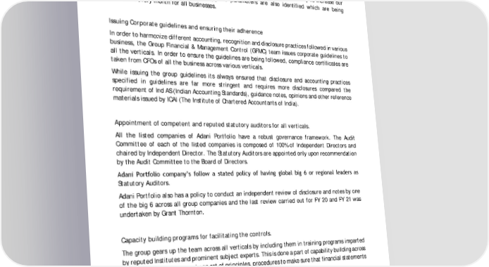 Periodic internal and external reviews of various processes At portfolio level, various processes are being monitored and based on risk assessment different processes are selected for internal or external reviews. In FY22 we have appointed Deloitte and many other auditing firms for doing a health checkup exercise for all business across different verticals. Similarly various processes are being continuously monitored internally to increase our own operating standards. Key book hygiene parameters are also identified which are being monitored every month for all businesses. Issuing Corporate guidelines and ensuring their adherence In order to harmonize different accounting, recognition and disclosure practices followed in various business, the Group Financial & Management Control (GFMC) team issues corporate guidelines to all the verticals. In order to ensure the guidelines are being followed, compliance certificates are taken from CFOs of all the business across various verticals. While issuing the group guidelines its always ensured that disclosure and accounting practices specified in guidelines are far more stringent and requires more disclosures compared the requirement of Ind AS (Indian Accounting Standards), guidance notes, opinions and other reference materials issued by ICAI (The Institute of Chartered Accountants of India). Appointment of competent and reputed statutory auditors for all verticals. All the listed companies of Adani Portfolio have a robust governance framework. The Audit Committee of each of the listed companies is composed of 100% of Independent Directors and chaired by Independent Director. The Statutory Auditors are appointed only upon recommendation by the Audit Committee to the Board of Directors. Adani Portfolio company’s follow a stated policy of having global big 6 or regional leaders as Statutory Auditors. Adani Portfolio also has a policy to conduct an independent review of disclosure and notes by one of the big 6 across all group companies and the last review carried out for FY 20 and FY 21 was undertaken by Grant Thornton. Capacity building programs for facilitating the controls. The group gears up the team across all verticals by including them in training programs imparted by reputed Institutes and prominent subject experts. This is done a part of capability building across all verticals. The team works on set of principles, procedures to make sure that financial statements reflect true and fair view of the state of affairs of all the listed entities. One example of major exercise undertaken in FY 22 across all verticals was preparing a comprehensive risk management (Hedging) policy, which is explained hereunder: Hedging policy: 25