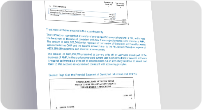 Treatment of these amounts in the acquiring entity The transaction represented a transfer of project specific amounts from CWIP & P&L, and to keep the treatment of the amount consistent with how it was originally treated in the financials of AMPL. The amount of A$92,928,540 (which represented the transfer of Exploration and Evaluation Assets) was recorded as CWIP and the balance amount taken to the P&L account through an expense of A$23,255,069 as general and administration expenses. The amount of A$23,255,069 presented as day one write off of CWIP were already part of the expenses of AMPL in the previous years and current year in which the transfer occurred and hence it was not an immediate write off of acquired assets but an accounting transfer of an amount from CWIP to P&L account as required and consistent with accounting principles. Source: Page 13 of the Financial Statement of Carmichael rail network trust for FY15 34