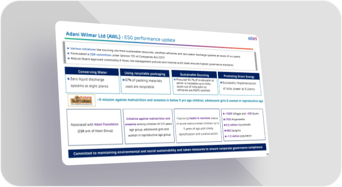 29 Adani Wilmar Ltd (AWL) : ESG performance update 29 ◼ Zero liquid discharge systems at eight plants ◼ 97% of packing materials used are recyclable ◼ Procured 95.7% of crude palm oil which is traceable up to mills; seven out of nine palm oil refineries are RSPO certified ◼ Successful implementation of solar power at 6 plants ◼ Various initiatives like sourcing oils from sustainable resources, certified refineries and zero water discharge systems at seven of our plants ◼ Formulated a CSR committee under Section 135 of Companies Act 2013 ◼ Robust Board approved commodity & forex risk management policies and internal audit team ensures highest governance standards Conserving Water Using recyclable packaging −A mission against malnutrition and anaemia in below 5 yrs age children, adolescent girls & women in reproductive age. ◼ ~1065 Villages and ~ 139 Slums ◼ 1700 Anganwadis ◼ 0.2 million Households ◼ 482 Sanginis ◼ ~1.3 million population Associated with Adani Foundation (CSR arm of Adani Group) Initiative against malnutrition and anaemia among children of 0 - 5 years age group, adolescent girls and women in reproductive age group Improving health & nutrition status of acute malnourished children up to 5 years of age with timely identification and curative action. Committed to maintaining environmental and social sustainability and taken measures to ensure corporate governance compliance Sustainable Sourcing Promoting Green Energy