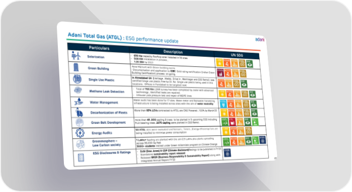 25 Particulars Description UN SDG Solarization - 650 Kw capacity Rooftop solar installed in 36 sites - 508 KW installation in process , - 1.2K MW by 2023 Green Building - New HQ built with Green building norms - Documentation and application to IGBC Gold rating certification (Indian Green Building Certification) process on - going. Single Use Plastic In Ahmedabad GA ( Heritage , Wadaj , Drive in , Maninagar and CGS Ramol) was certified Singe use plastic free by CII. No Single use plastic being used in this locations . Offices in Faridabad to be targeted next Methane Leak Detection - Total of 700 Km LDAR survey has been completed by Josler with advanced technology , Identified leaks are repaired. - Inhouse Lock pressure test and repair of MDPE lines Water Management Water audit has been done for 17 sites. Water meter and Rainwater harvesting infrastructure is being installed across sites with the aim of water neutrality Decarbonization of Fleets More than 85% LCVs contracted to ATGL are CNG Powered , 100% by March’23 Green Belt Development more than 45 ,000 sapling & trees to be planted in 9 upcoming CGS including fruit bearing trees. 2075 sapling were planted in CGS Ramol. Energy Audits 50 ATGL sites were evaluated and Sensors , Timers , Energy efficiency fans are being installed to minimize power consumption Greenmosphere – Low Carbon society 1 Lakhs+ Sapling are planted with the aim 2.5 Lakhs plus plants spreading across 36,000 Sq feet 3000+ students trained under Green millennials program on Climate Change ESG Disclosures & Ratings - DJSI (Dow Jones) & CDP (Climate disclosure) Ratings to be published in FY’23 - Standalone sustainability report released - Released BRSR (Business Responsibility & Sustainability Report) along with Integrated Annual Report FY’22 Adani Total Gas (ATGL) : ESG performance update
