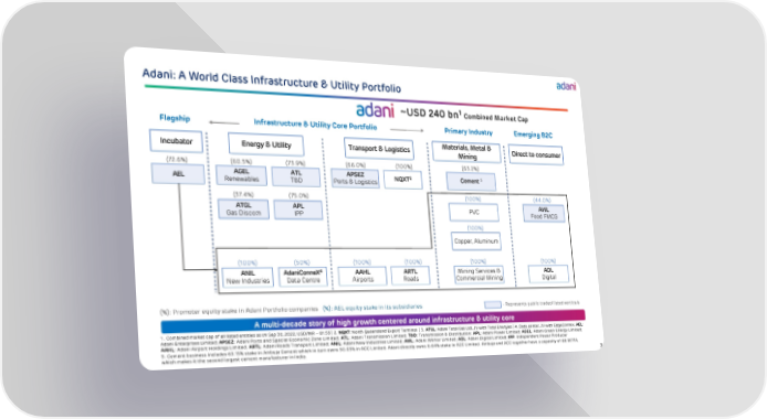 3 Adani: A World Class Infrastructure & Utility Portfolio ~USD 240 bn 1 Combined Market Cap 1 . Combined market cap of all listed entities as on Sep 30, 2022, USD/INR – 81.55 | 2. NQXT : North Queensland Export Terminal | 3. ATGL : Adani Total Gas Ltd, JV with Total Energies | 4. Data center, JV with EdgeConnex, AEL : Adani Enterprises Limited; APSEZ : Adani Ports and Special Economic Zone Limited; ATL : Adani Transmission Limited; T&D : Transmission & Distribution; APL : Adani Power Limited; AGEL : Adani Green Energy Limited; AAHL : Adani Airport Holdings Limited; ARTL : Adani Roads Transport Limited; ANIL: Adani New Industries Limited; AWL : Adani Wilmar Limited; ADL : Adani Digital Limited; IPP : Independent Power Producer 5. Cement business includes 63.15% stake in Ambuja Cement which in turn owns 50.05% in ACC Limited. Adani directly owns 6.64% stake in ACC Limited. Ambuja and ACC together have a capacity of 66 MTPA, which makes it the second largest cement manufacturer in India. ANIL New Industries AdaniConneX 4 Data Centre ( 100% ) (5 0% ) AAHL Airports ARTL Roads (10 0% ) (10 0% ) ( % ): Promoter equity stake in Adani Portfolio companies (%): AEL equity stake in its subsidiaries A multi - decade story of high growth centered around infrastructure & utility core Energy & Utility Transport & Logistics Infrastructure & Utility Core Portfolio AGEL Renewables ATL T&D ATGL Gas Discom APL IPP APSEZ Ports & Logistics NQXT 2 (60.5 % ) (73.9 % ) (37.4 % ) (75.0 % ) (66.0 % ) (100 % ) AWL Food FMCG ADL Digital (10 0% ) (44.0 % ) PVC Mining Services & Commercial Mining (100%) (100%) Copper, Aluminum (100%) Materials, Metal & Mining Cement 5 (63.2 % ) Primary Industry Direct to consumer Emerging B2C AEL (72.6 % ) Incubator Flagship - Represents public traded listed verticals