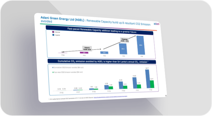 Adani Green Energy Ltd (AGEL) : Renewable Capacity build up & resultant CO2 Emission avoided 22 Cumulative CO 2 emission avoided by AGEL is higher than Sri Lanka’s annual CO 2 emission 1 Fast - paced Renewable Capacity addition leading to a greener future 0.14 0.58 1.80 5.38 9.40 14.60 24.77 0.14 0.44 1.22 3.58 4.02 5.20 10.17 FY16 FY17 FY18 FY19 FY20 FY21 FY22 Cumulative CO2 Emission avoided (Mn ton) Year wise CO2 Emission avoided (Mn ton) 1. Sri Lanka had an annual CO2 2emission of 21.11 mn ton in 2020.Source : https://ourworldindata.org/co2 - emissions#co2 - emissions - by - region FY16 FY21 FY22 FY25 FY30 0.3 3.5 5.4 25.0 45.0 Historical Targeted Projected CAGR: ~ 30% Historic CAGR: 60%