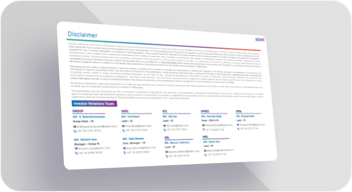 Certain statements made in this presentation may n o t be based on historical information or fa c ts and may be “forward - looking statements,” including those relating to general business plans and strategy of Adani group , the f u t u r e outlook and g r o w t h prospects, and f u t u r e developments of th e business and t h e competitive and regulatory environment, and statements whi c h contain words or phrases such as ‘will’, ‘expected to’, etc . , or similar expressions or variations of such expressions . Actual results may dif f e r materially from these forward - looking statements due to a number of factors, including f u t u r e changes or developments in th ei r business, th e ir competitive environment, t h ei r ability to implem ent th ei r strategies and initiatives and respond to technological changes and political, economic, regulatory and social conditions in India . This presentation does n o t c o ns t i t u te a prospectus, offering circular or offering memorandum or an offer, or a solicitation of any offer, to purchase or sell, any shares and should n o t be considered as a recommendation t h a t any investor should subscribe fo r or purchase any of Adani group entities shares . Neither this presentation nor any other documentation or information (or any part thereof) delivered or supplied under or in relation to t h e shares shall be deemed to c o n s t i t u t e an o f f e r of or an invitation by or on behalf of Adani group . Adani group, as such, makes no representation or warranty, express or implied, as to, and does n o t accept any responsibility or liability w i t h respect to, t h e fairness, accuracy, completeness or correctness of any information or opinions contained herein . The information contained in this presentation, unless otherwise specified is only current as of t h e date of this presentation . Adani group assumes no responsibility to publicly amend, modify or revise any forward - looking statements, on t h e basis of any subsequent development, information or events, or otherwise . Unless otherwise stated in this document, t h e information contained herein is based on management information and estimates . The information contained herein is subject to change w i t h o u t notic e and past performance is n o t indicative of f u t u r e results . Adani group may alter, modify or otherwise change in any manner t h e c o n t e n t of this presentation, w i t h o u t obligation to n o t i f y any person of such revision or changes . No person is authorised to give any information or to make any representation n o t contained in and n o t consistent w i t h this presentation and, if given or made, such information or representation must n o t be relied upon as having been authorised by or on behalf of Adani group . This presentation does n o t co n s t i t u t e an o f f e r or invitat ion to purchase or subscribe f o r any securities in any jurisdiction, including t h e United States . No part of its should form t h e basis of or be relied upon in connection w i t h any investment decision or any c o n t r a c t or c o mm i tm e nt to purchase or subscribe f or any securities . None of our securities may be offered or sold in t h e United States, w i t h o u t registration under t h e U . S . Securities A c t of 1933 , as amended, or pursuant to an exemption from registration therefrom . Disclaimer Investor Relations Team: MR. Charanjit Singh Head – ESG & IR [email protected] +91 79 2555 7712 MR. Manan Vakharia Lead – IR [email protected] +91 79 2555 6140 MR. Priyansh Shah Lead – IR [email protected] +91 79 2555 7139 MR. Abhik Das Lead – IR [email protected] +91 79 2555 7139 MR. Vijil Jain Lead – IR [email protected] +91 79 2555 7947 MR. D. Balasubramanyam Group Head – IR [email protected] +91 79 2555 9332 MR. Nishant Vyas Manager – Group IR [email protected] +91 79 2555 9333 MR. Viral Raval Lead – IR [email protected] +91 79 2555 8581 MR. Arpit Mundra Asst. Manager – IR [email protected] +91 79 2555 9500