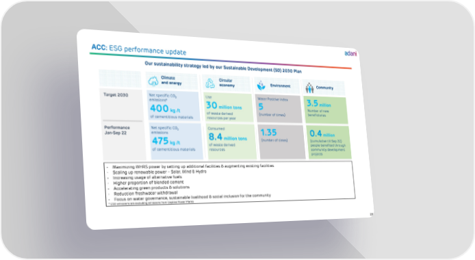 28 Our sustainability strategy led by our Sustainable Development (SD) 2030 Plan Target 2030 Climate and energy Circular economy Environment Community Net specific CO 2 emissions* 400 kg /t of cementitious materials Use 30 million tons of waste derived resources per year Water Positive Index 5 (number of times) 3.5 million Number of new beneficiaries Net specific CO 2 emissions 475 kg /t of cementitious materials Consumed 8.4 million tons of waste derived resources 1.35 (number of times) 0.4 million (cumulative till Sep 22) people benefited through community development projects Performance Jan - Sep 22 - Maximizing WHRS power by setting up additional facilities & augmenting existing facilities - Scaling up renewable power – Solar, Wind & Hydro - Increasing usage of alternative fuels - Higher proportion of blended cement - Accelerating green products & solutions - Reduction freshwater withdrawal - Focus on water governance, sustainable livelihood & social inclusion for the community * CO2 emissions are excluding emissions from Captive Power Plants ACC: ESG performance update